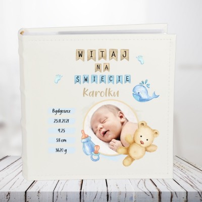 PERSONALIZOWANY ALBUM - to wyjątkowy prezent z okazji, roczku, urodzin. Pozwoli na przechowanie najcenniejszych wspomnień. Okładka zawiera zdjęcie maluszka, imię oraz ozdobne grafiki. SZCZEGÓŁY: format 10x15 / 200 zdjęć wymiar albumu szer. 20 cm, wys. 22,5 cm, grubość grzbietu 5 cm.