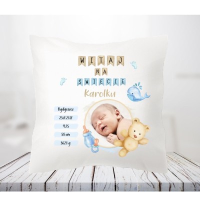METRYCZKA NARODZIN W FORMIE FOTO PODUSZKI Z TWOIM ZDJĘCIEM - to piękny prezent z okazji narodzin maluszka, roczku, urodzin, chrztu. Przepiękny element wyposażenia pokoju dziecka i wspaniała pamiątka. Specyfikacja: Wymiary: 40cm x 40cm (+/-2cm) Poszycie: Mikrofibra Gramatura: 180g/m2...