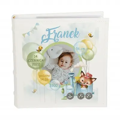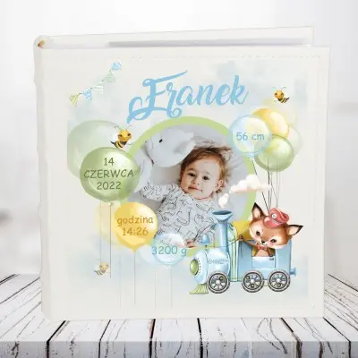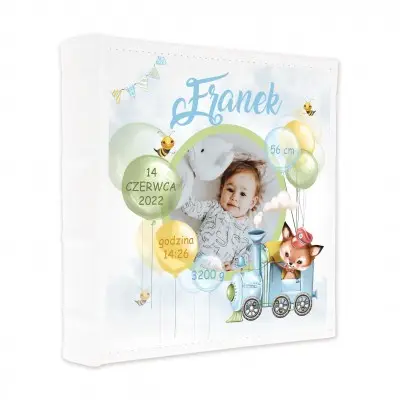 Okładka przedstawia zdjęcie dziecka ozdobione bajkową lokomotywą z liskiem oraz kolorowymi balonikami, na których znajdują się dane dziecka, wszystko dopełniają chmurki w tle!