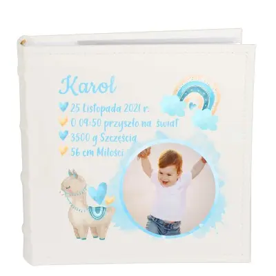 Album zdobiony bajkowymi elementami, które przedstawiają balonika z imieniem dziecka orz lamę, chmurki i serduszka :))
