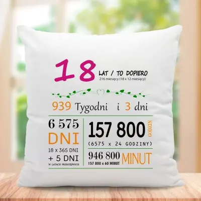 Poduszka jako pomysłowy prezent z nadrukowaną ilością przespanych lat, miesięcy, tygodni, dni, godzin i minut!!