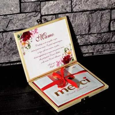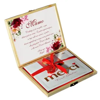 W środku znajdują się czekoladki Merci, które wywołają uśmiech na twarzy Twojej Mamy! ;))