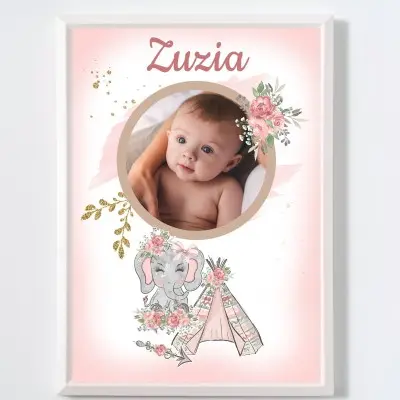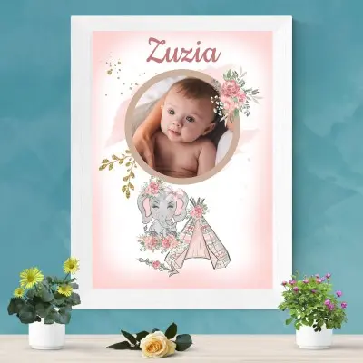 Zdjęcie maluszka w owalnym kształcie zdobi piękna kwiatowa wiązanka, całości towarzyszy bajkowy słonik 🙂