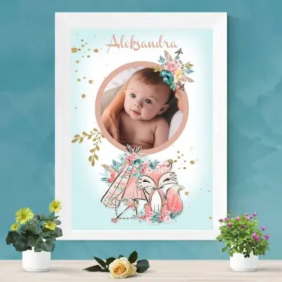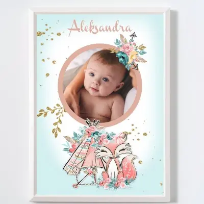 Zdjęcie maluszka w owalnym kształcie zdobi piękna kwiatowa wiązanka, całości towarzyszy bajkowa lisiczka 🙂