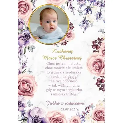 Chrzest Święty to wyjątkowy dzień w życiu Twojego dziecka. Wybierając rodziców chrzestnych kierujesz się dobrem swojego maluszka. Podziękuj im za obecność w tym szczególnym dniu w oryginalny sposób. Podziękowania ze zdjęciem Twojej pociechy z całą pewnością ich zachwycą.