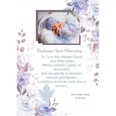 Chrzest Święty to wyjątkowy dzień w życiu Twojego dziecka. Wybierając rodziców chrzestnych kierujesz się dobrem swojego maluszka. Podziękuj im za obecność w tym szczególnym dniu w oryginalny sposób. Podziękowania ze zdjęciem Twojej pociechy z całą pewnością ich zachwycą.