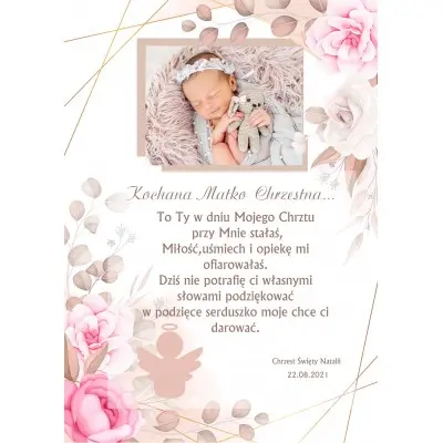 Nadruk przedstawia śliczne różowe róże zdobiące zdjęcie dziecka oraz elegancki tekst