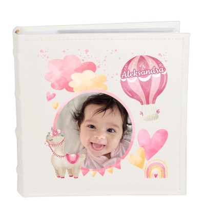 Album zdobiony bajkowymi elementami, które przedstawiają balonika z imieniem dziecka oraz lamę, chmurki i serduszka :))