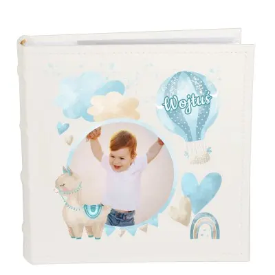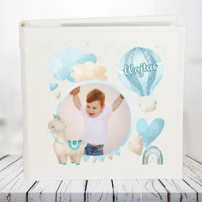 Album zdobiony bajkowymi elementami, które przedstawiają balonika z imieniem dziecka orz lamę, chmurki i serduszka.