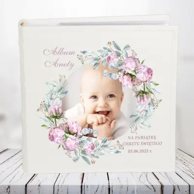 Album zawiera kwiatowe elementy ozdabiające zdjęcie chrześniaka a tekst pisany jest w ślicznej czcionce
