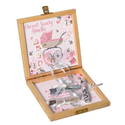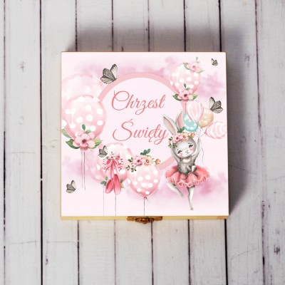 Jest to drewniana skrzyneczka w różowych barwach z bajkowym nadrukiem, przedstawiającym zajączka, baloniki i motylki. W środku znajduje się tekst z życzeniami. Całość starannie wykonana w wysokiej jakości wydruku i z wysokiej jakości sklejki.