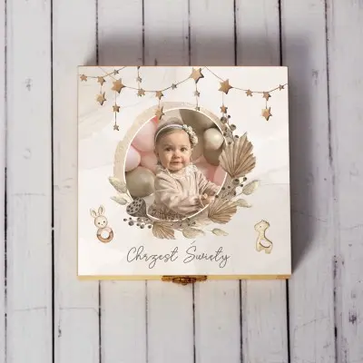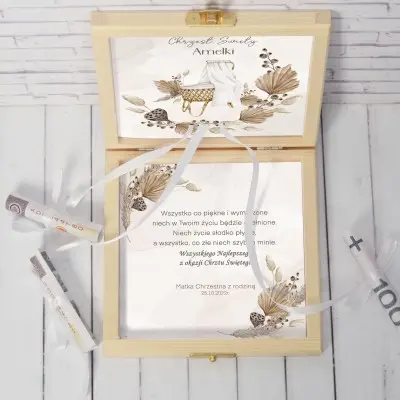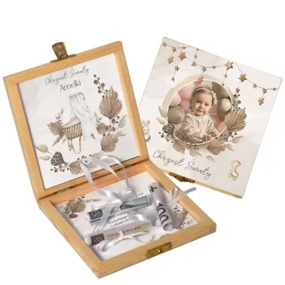 Jest to drewniana skrzyneczka z prostym a zarazem efektownym nadrukiem. Centrum stanowi zdjęcie ozdobione ornamentami roślinnymi. W środku znajdują się dekoracyjne etykiety z życzeniami i śliczną grafiką. POLSKA PRODUKCJA