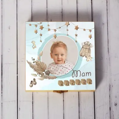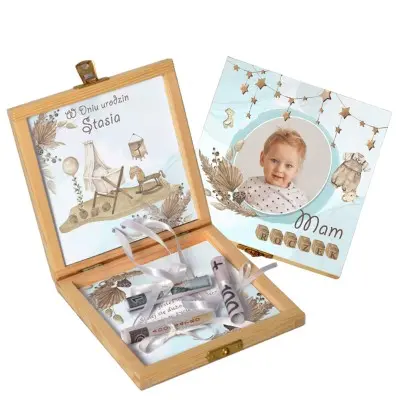 Jest to drewniana skrzyneczka z prostym a zarazem efektownym nadrukiem. Centrum stanowi zdjęcie ozdobione ornamentami roślinnymi. W środku znajdują się dekoracyjne etykiety z życzeniami i śliczną grafiką. POLSKA PRODUKCJA