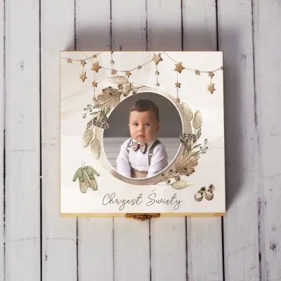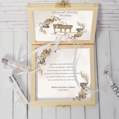 Jest to drewniana skrzyneczka z prostym a zarazem efektownym nadrukiem. Centrum stanowi zdjęcie ozdobione ornamentami roślinnymi. W środku znajdują się dekoracyjne etykiety z życzeniami i śliczną grafiką. POLSKA PRODUKCJA