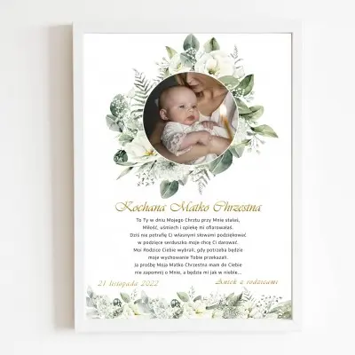 Chrzest Święty to wyjątkowy dzień w życiu Twojego dziecka. Wybierając rodziców chrzestnych kierujesz się dobrem swojego maluszka. Podziękuj im za obecność w tym szczególnym dniu w oryginalny sposób. Podziękowania ze zdjęciem Twojej pociechy z całą pewnością ich zachwycą, tym bardziej, że już przed zakupem możesz zobaczyć efekt końcowy. WYDRUK W FORMACIE A4 (21×29,7mm) + ramka do powieszenia.