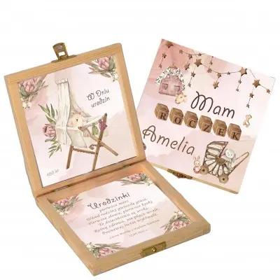 Jest to drewniana skrzyneczka z nadrukiem wykonanym w technice UV, w środku znajdą państwo dekoracyjne etykiety i wysokiej jakości wydruk z życzeniami.