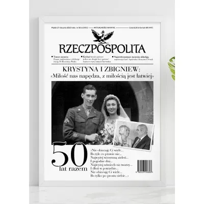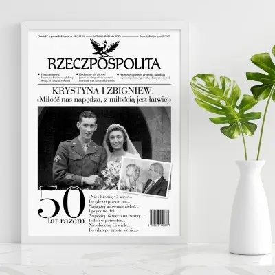 Każda rocznica ślubu to wyjątkowe wydarzenie, które zasługuje na równie wyjątkową pamiątkę! Personalizowany plakat w formie okładki gazety „Rzeczpospolita” to oryginalny i elegancki prezent na 10, 20, 30, 40, 50 i każdą inną rocznicę – bo każda miłość ma swoją piękną historię.