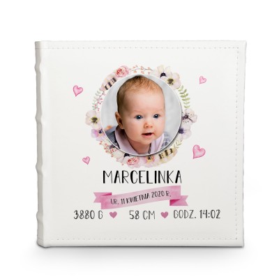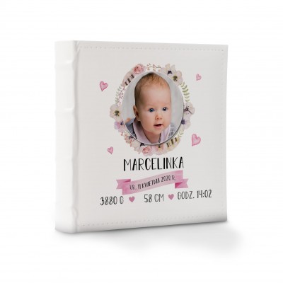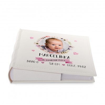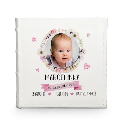 Personalizowany album na zdjęcia z ozdobną grafiką zawierająca kwiaty, oraz metryczką narodzin. Dzięki albumowi możesz uwiecznić życie swojego dziecka od jego początku.