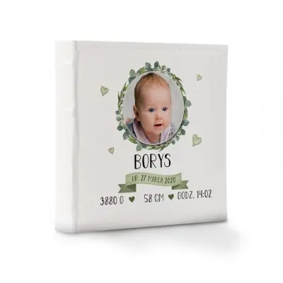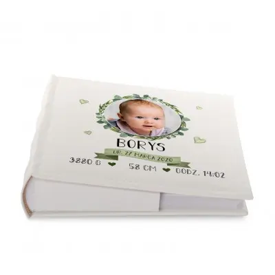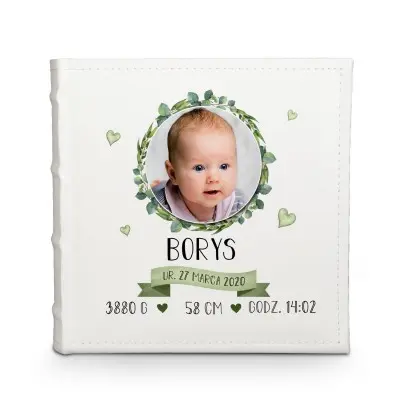 Personalizowany album na zdjęcia z ozdobną grafiką zawierająca rośliny, oraz metryczką narodzin. Dzięki albumowi możesz uwiecznić życie swojego dziecka od jego początku.