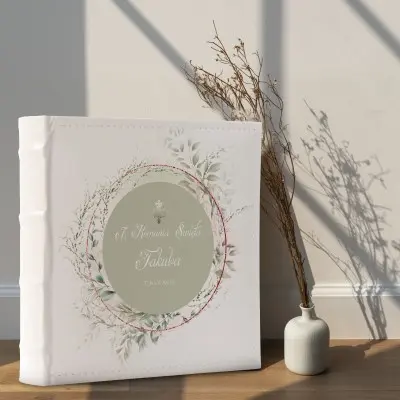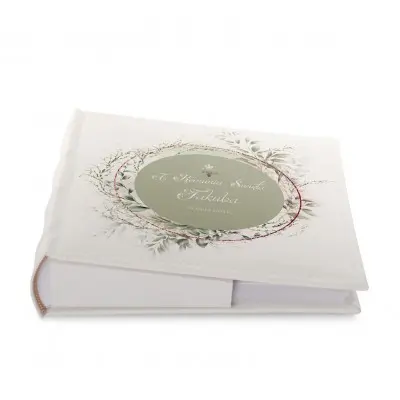 Jest starannie zaprojektowany i zawiera okładkę ozdobioną w rośliny z pamiątkowym napisem.