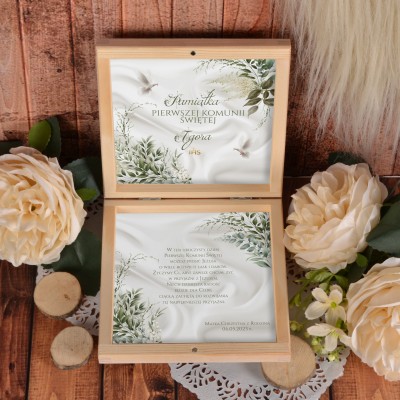 - Jest to drewniana skrzyneczka z nadrukiem, w środku znajdą państwo dekoracyjne etykiety oraz wydruk z życzeniami.