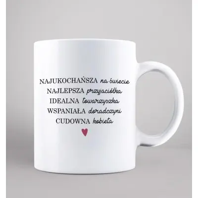 Zestaw zawiera uroczą poduszkę oraz kubek, oba ozdobione sentymentalnym napisem: „Mama najukochańsza na świecie, Najlepsza przyjaciółka, Idealna towarzyszka, Wspaniała doradczyni, Cudowna kobieta.” Każde słowo oddaje niezastąpioną rolę, jaką odgrywa w Twoim życiu!