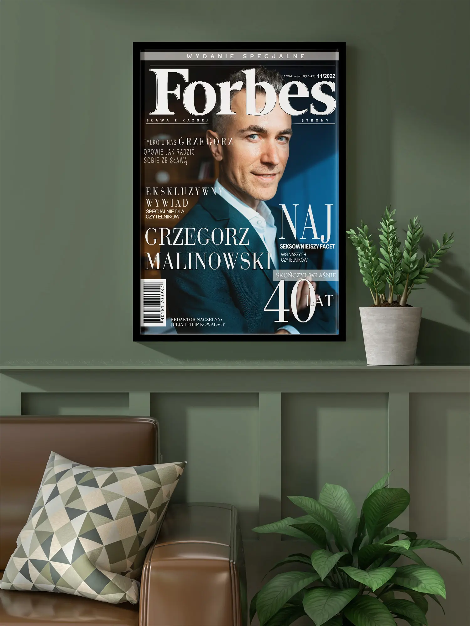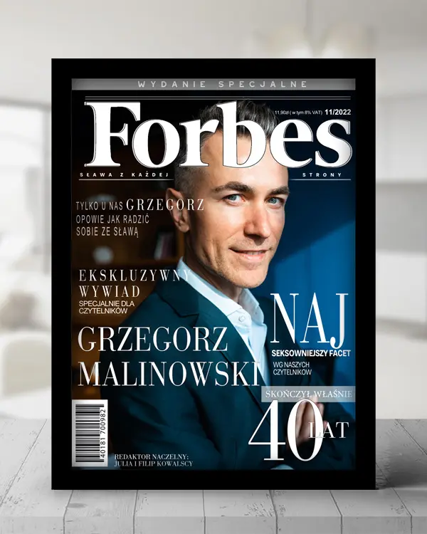Plakat FORBES to ekskluzywny prezent dla mężczyzny, który lubi wyróżniać się w tłumie. Personalizowana okładka magazynu z jego wizerunkiem to doskonały sposób na uhonorowanie jego sukcesów – zawodowych i osobistych. Dzięki eleganckiej oprawie w czarnej ramce, plakat stanie się nie tylko oryginalnym upominkiem, ale również stylowym elementem dekoracyjnym, który idealnie wpasuje się w każde wnętrze. Podaruj mu moment, w którym stanie się gwiazdą biznesu – to super pomysł na prezent, który z pewnością go zaskoczy i wywoła uśmiech!