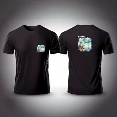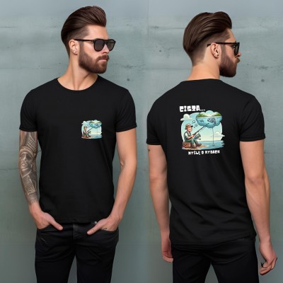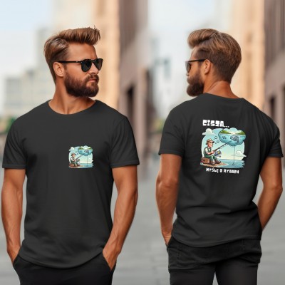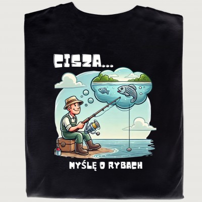 Dla tych, którzy odnajdują spokój i radość w wędkowaniu! Ta koszulka z grafiką szczęśliwego wędkarza i napisem „Cisza, myślę o rybach” to idealny wybór dla każdego pasjonata, który kocha spędzać czas nad wodą.