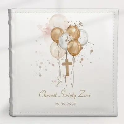 Personalizowany album na pamiątkę Chrztu Świętego, stworzony z myślą o najpiękniejszych chwilach tego wyjątkowego dnia. Okładkę zdobi subtelna, elegancka grafika delikatnych baloników, które symbolizują radość i nadzieję. Centralnym punktem jest krzyż, symbolizujący błogosławieństwo i opiekę Bożą. Na okładce widnieje napis: Chrzest Święty, imię dziecka oraz data ceremonii – wyjątkowy detal, który nadaje osobisty charakter i zachowa wspomnienia na lata.