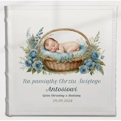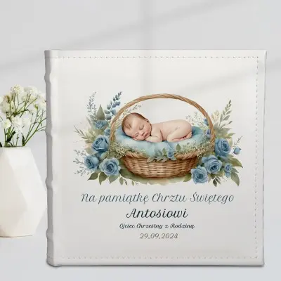 Elegancki, personalizowany album upamiętniający wyjątkowy dzień Chrztu Świętego. Album jest ozdobiony napisem Na Pamiątkę Chrztu Świętego oraz imieniem dziecka, datą uroczystości i dedykacją od Ojca Chrzestnego z Rodziną.