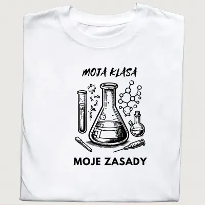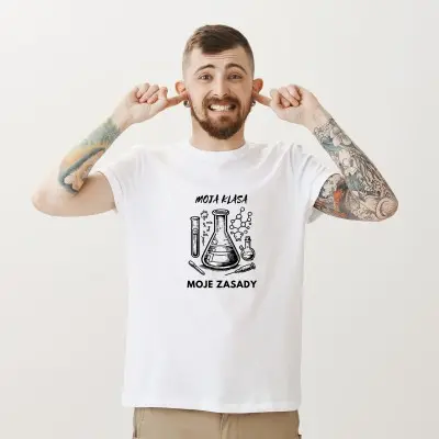 Ta koszulka to prawdziwy hit dla nauczycieli chemii i wszystkich, którzy wiedzą, że w klasie liczy się nie tylko wiedza, ale i zasady! Z napisem „Moja klasa, moje zasady” i grafiką probówek oraz wzorów chemicznych, idealnie oddaje ducha nauki i porządku w laboratorium.