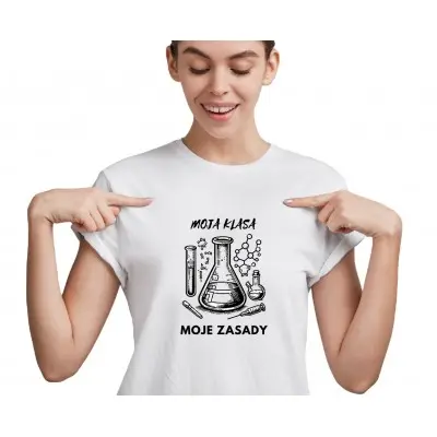 Koszulka „Moja klasa, moje zasady” to doskonały wybór na Dzień Nauczyciela, zakończenie roku szkolnego lub jako wyjątkowy upominek dla nauczyciela chemii, który z pasją przekazuje wiedzę i trzyma porządek w klasie.