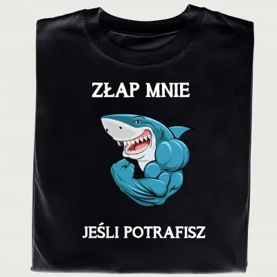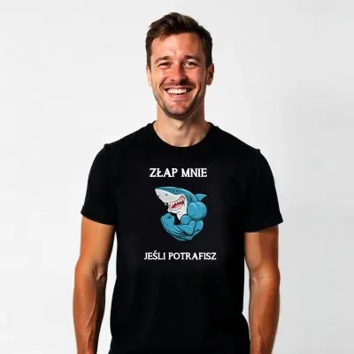 Dynamiczna koszulka z unikalnym nadrukiem przedstawiającym uśmiechniętego rekina z muskularną ręką, który z dumą pokazuje zaciśniętą pięść. Dodatkowy napis „Złap mnie, jeśli potrafisz” dodaje motywacyjnego charakteru i odrobinę humoru. Idealna dla osób ceniących pewność siebie, aktywny styl życia i odrobinę luzu. Świetny wybór na siłownię, plażę czy jako wyraz Twojej niezłomnej energii!