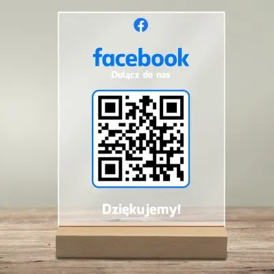Tabliczka Akrylowa z Kodem QR do Facebooka – elegancka, nowoczesna tabliczka, która pozwoli Twoim klientom szybko połączyć się z Twoją stroną na Facebooku. Wystarczy zeskanować kod QR, aby polubić profil i śledzić aktualności Twojej firmy. Wykonana z wysokiej jakości akrylu, odporna na zarysowania i blaknięcie. Idealna do biur, salonów, restauracji i innych punktów usługowych.