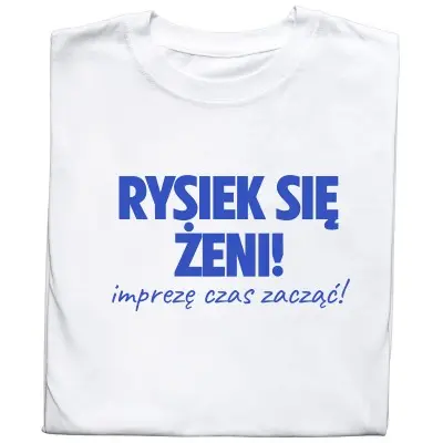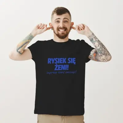Niech wszyscy wiedzą, kto dziś jest królem imprezy! Koszulka „Rysiek Się Żeni! Imprezę Czas Zacząć!” to idealny wybór na wieczór kawalerski pełen śmiechu i niezapomnianych wspomnień.