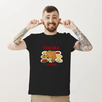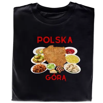 Jeśli uwielbiasz tradycyjne polskie jedzenie, ta koszulka jest dla Ciebie! Grafika przedstawiająca schabowego, ziemniaczki, pierogi i bigos w połączeniu z napisem „Polska Górą” to doskonały sposób, by z dumą pokazać, że nasza kuchnia nie ma sobie równych.