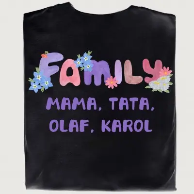 Podkreślcie swoją rodzinną więź w wyjątkowy sposób! Ten zestaw czterech koszulek to świetna opcja dla każdej rodziny, która lubi być razem i wyglądać spójnie. Delikatna grafika kwiatów oraz napisy „Family” sprawiają, że ten komplet to nie tylko ubrania, ale też piękna pamiątka na lata. Na przodzie koszulek znajduje się subtelny napis „Family”, a na tyłach – duży napis „Family” oraz imiona „Mama”, „Tata” i dzieci, które dodają osobistego charakteru każdej koszulce.