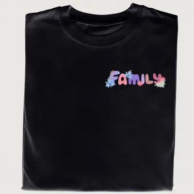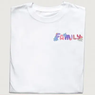 - Stylowy i subtelny design – delikatne kwiatowe akcenty oraz minimalistyczny napis „Family” na przodzie koszulki.