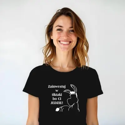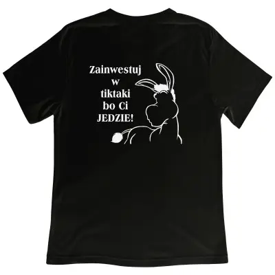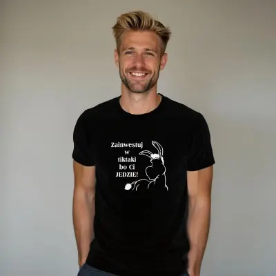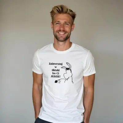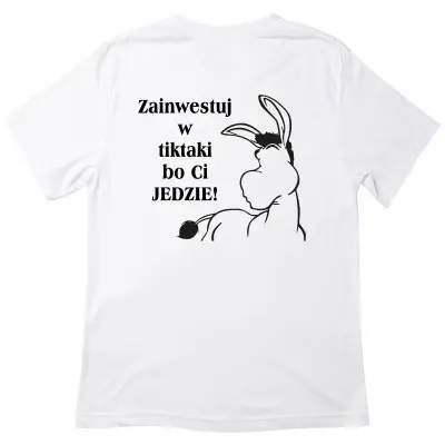 Szukasz oryginalnej koszulki, która rozbawi każdego? Koszulka z napisem „Zainwestuj w Tiktaki, bo Ci jedzie!” i grafiką szkicu osła to idealny wybór!