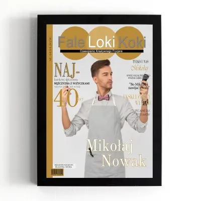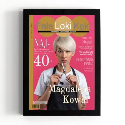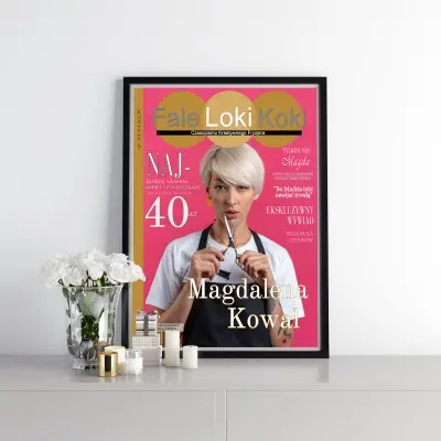 Okładka magazynu „Fale Loki Koki” w formacie 21×30 cm, w eleganckiej czarnej ramce, doskonale nadaje się do postawienia lub powieszenia. To idealny sposób na uznanie pracy fryzjera, który z pasją tworzy piękne fryzury. Doskonały prezent na urodziny, rocznicę pracy czy Dzień Fryzjera!