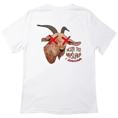Koszulka z napisem „Koza też myślała i zdechła” to świetny wybór dla każdego, kto lubi ironię i humor w najczystszej postaci. To zabawny sposób na pokazanie, że czasami lepiej odpuścić i nie brać wszystkiego zbyt poważnie – a już na pewno nie za bardzo „myśleć”!