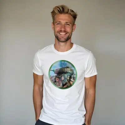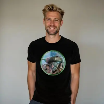 Koszulka z nadrukiem przedstawiającym ekipę z „Czterech pancernych i psa” w charakterystycznym ujęciu – w kółku, z czołgiem w tle – to prawdziwy hołd dla klasyki polskiej telewizji.