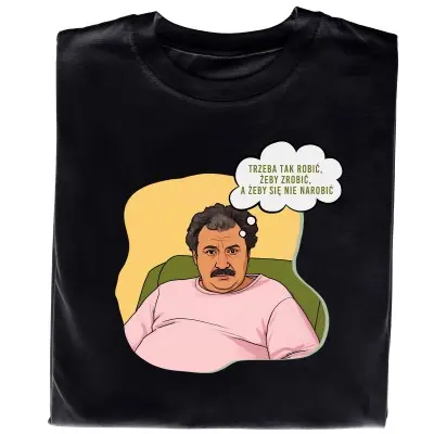 Koszulka z kultowym cytatem Ferdynanda Kiepskiego: „Trzeba tak robić, żeby zrobić, a żeby się nie narobić” – idealna propozycja dla wszystkich mistrzów życiowej filozofii na luzie! Doskonały prezent dla tych, którzy cenią wygodę, święty spokój i niepowtarzalny humor rodem ze „Świata według Kiepskich”.