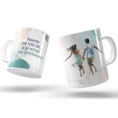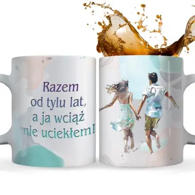 Kubek z napisem „Razem od tylu lat, a ja wciąż nie uciekłem” to idealny wybór na rocznicę, walentynki lub po prostu jako żartobliwy upominek dla męża, żony, chłopaka czy dziewczyny.