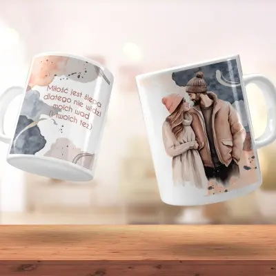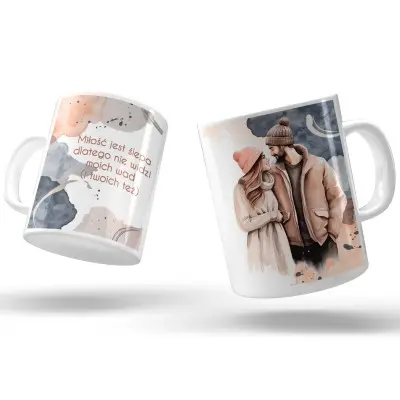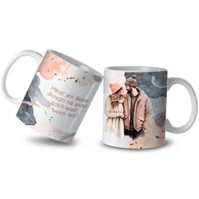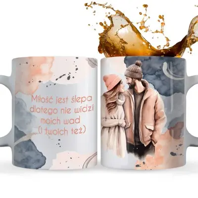 Kubek z napisem „Miłość jest ślepa, dlatego nie widzi moich wad (i Twoich też)” to idealny wybór dla par, które potrafią śmiać się z siebie nawzajem i cenią codzienny dystans.