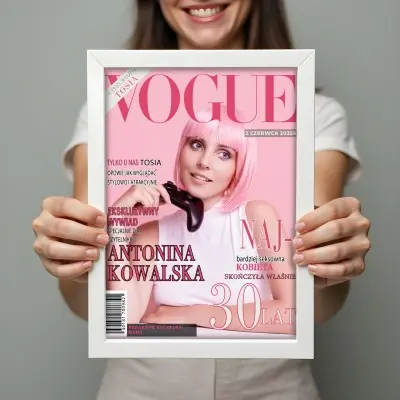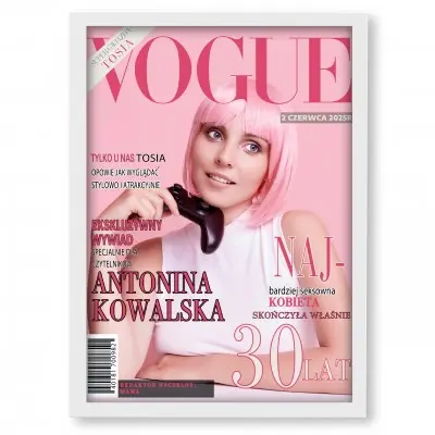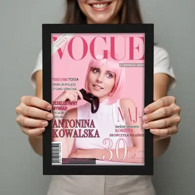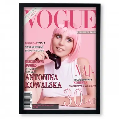 Personalizowana okładka VOGUE w formacie 30×40 cm to wyjątkowy prezent, dzięki któremu poczujesz się jak prawdziwa gwiazda. Dodaj własne zdjęcie, imię oraz unikalne nagłówki, które podkreślą Twój styl, pasje i osobowość.