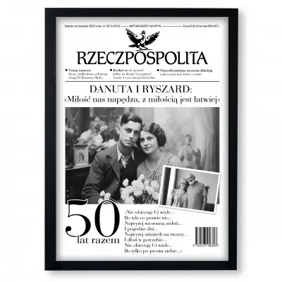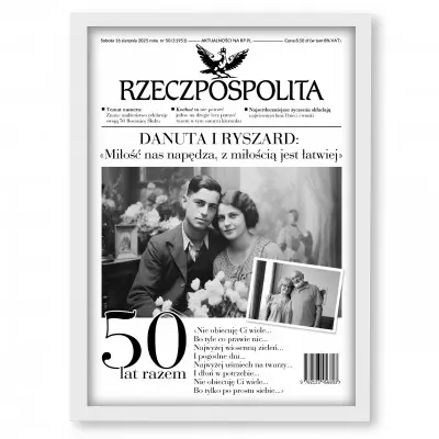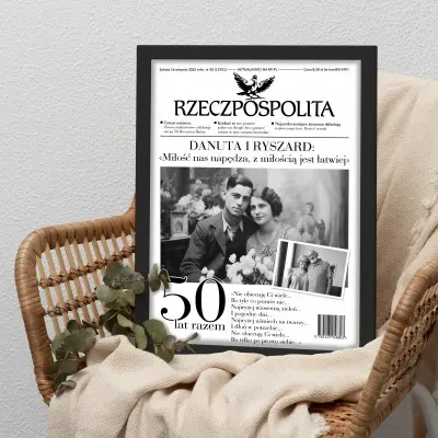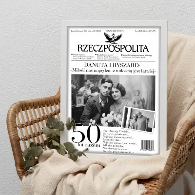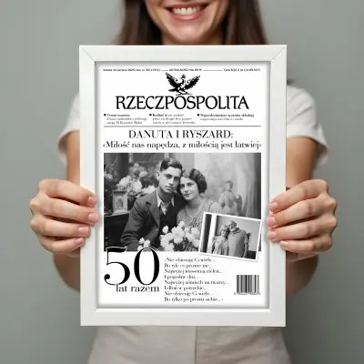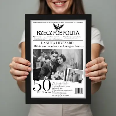 Każda rocznica ślubu zasługuje na wyjątkową pamiątkę! Nasz personalizowany plakat w formie okładki gazety „Rzeczpospolita” to elegancki i oryginalny prezent na 10, 20, 30, 40, 50 i każdą inną rocznicę – bo każda miłość ma swoją piękną historię.