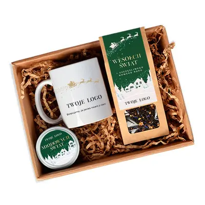 Zestaw świąteczny z logo firmy to wyjątkowy pomysł na prezent dla pracowników, kontrahentów i partnerów biznesowych. Każdy zestaw zawiera elegancki kubek z indywidualnym nadrukiem, aromatyczną herbatkę Pomarańcza z Cynamonem oraz słoiczek naturalnego miodu lipowego – całość zapakowana w stylowy box prezentowy.