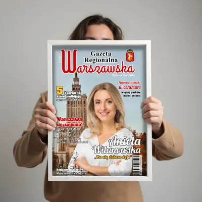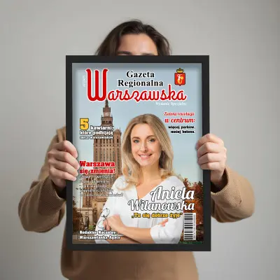 Poczuj się jak prawdziwa gwiazda lokalnych mediów! Personalizowany plakat „Gazeta Regionalna Warszawska” to wyjątkowy i zabawny prezent, dzięki któremu obdarowana osoba znajdzie się na pierwszej stronie własnej gazety. Dodaj zdjęcie, imię i nazwisko oraz podpis od kogo, a my przygotujemy unikalny plakat stylizowany na okładkę regionalnego dziennika – profesjonalny, stylowy i pełen charakteru.