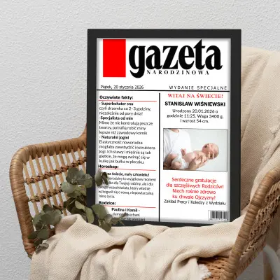 Uchwyć jeden z najpiękniejszych momentów życia! Personalizowany plakat „Gazeta Narodzinowa” ze zdjęciem to wzruszająca pamiątka narodzin dziecka, przygotowana w formie okładki gazety. Wystarczy podać zdjęcie maluszka, imię, datę i godzinę urodzin, wagę, wzrost oraz dedykację, a my stworzymy jedyny w swoim rodzaju plakat, który pięknie opowie historię pierwszych chwil na świecie.